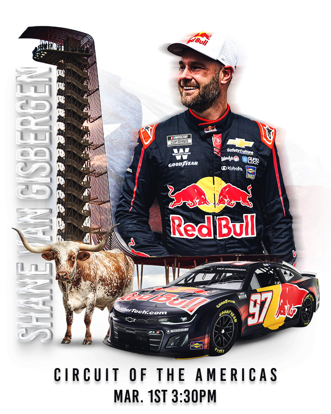 My original idea was to take the track layout and have it wrap around the COTA skytower and SVG. Though once I saw the track layout, I realized that wasn't going to work. I pivoted to add in a Texas Longhorn instead, while also putting the Texas state flag in the background.
